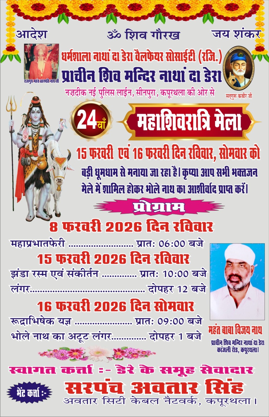 ट्रिब्यून टाइम्स न्यूज : कपूरथला धर्मशाला नाथां दा डेरा वेलफेयर सोसायटी (रजि.) द्वारा प्राचीन शिव मंदिर नाथां दा डेरा, नजदीक नई पुलिस लाइन, सीनपुरा (कपूरथला) की ओर से 24वां महाशिवरात्रि मेला 15 फरवरी (रविवार) और 16 फरवरी (सोमवार) को बड़े धूमधाम से आयोजित किया जाएगा। इस बाबत डेरे के महंत बाबा विजय नाथ ने बताया कि मेले को लेकर मंदिर परिसर में तैयारियां जोरों पर हैं और भक्तजनों में भारी उत्साह पाया जा रहा है। उन्होंने बताया कि 15 फरवरी दिन रविवार को सुबह 10:00 बजे झंडे की
